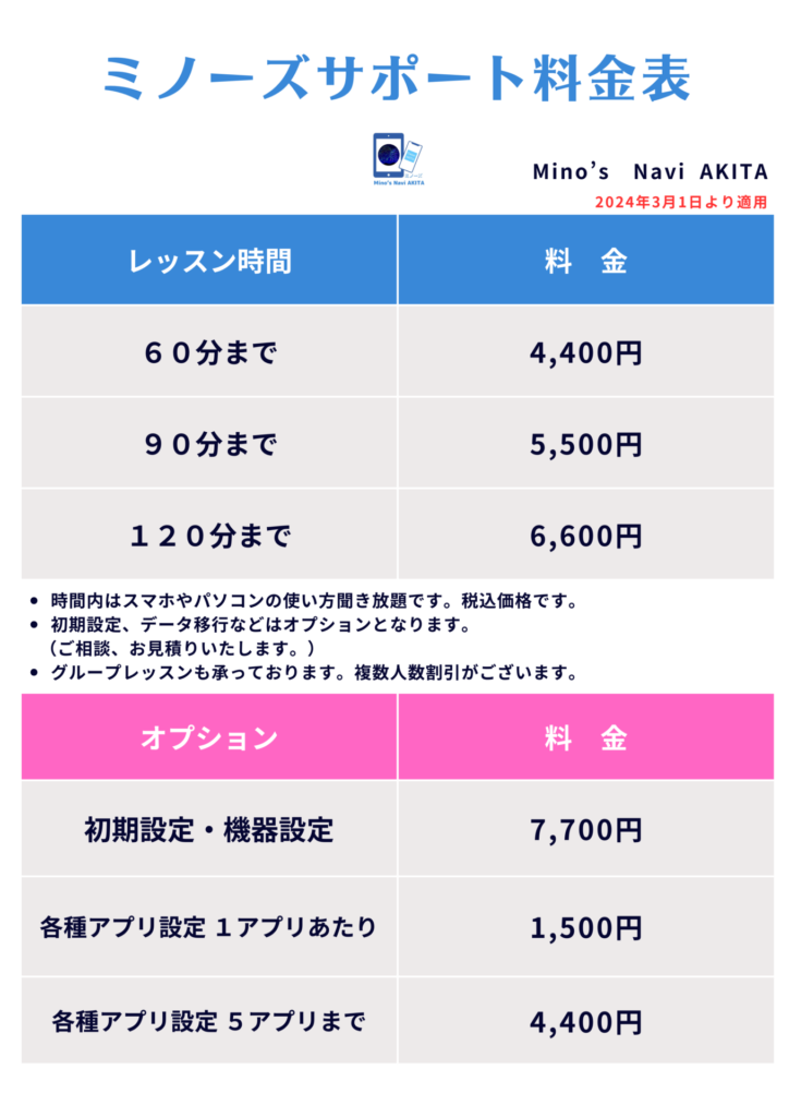 ※現在ミノーズじっくりレッスンコース会員のお客様で以前に発行した回数券は期限に関係なくご利用いただけます。新規でご購入の場合は上記料金が適用されます。