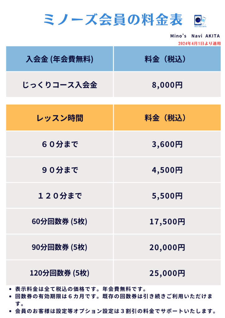 ※現在ミノーズじっくりレッスンコース会員のお客様で以前に発行した回数券は期限に関係なくご利用いただけます。新規でご購入の場合は上記料金が適用されます。